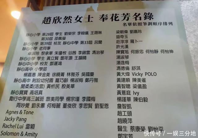奉花芳名录上明星排第一的是梁朝伟刘嘉玲夫妇,还有我们熟悉的舒淇和冯德伦夫妇、许光汉他们都送去了特定制的花篮。其他的大多数都是赵欣然女士的学生,有小学部的、高中部的学生和校友。